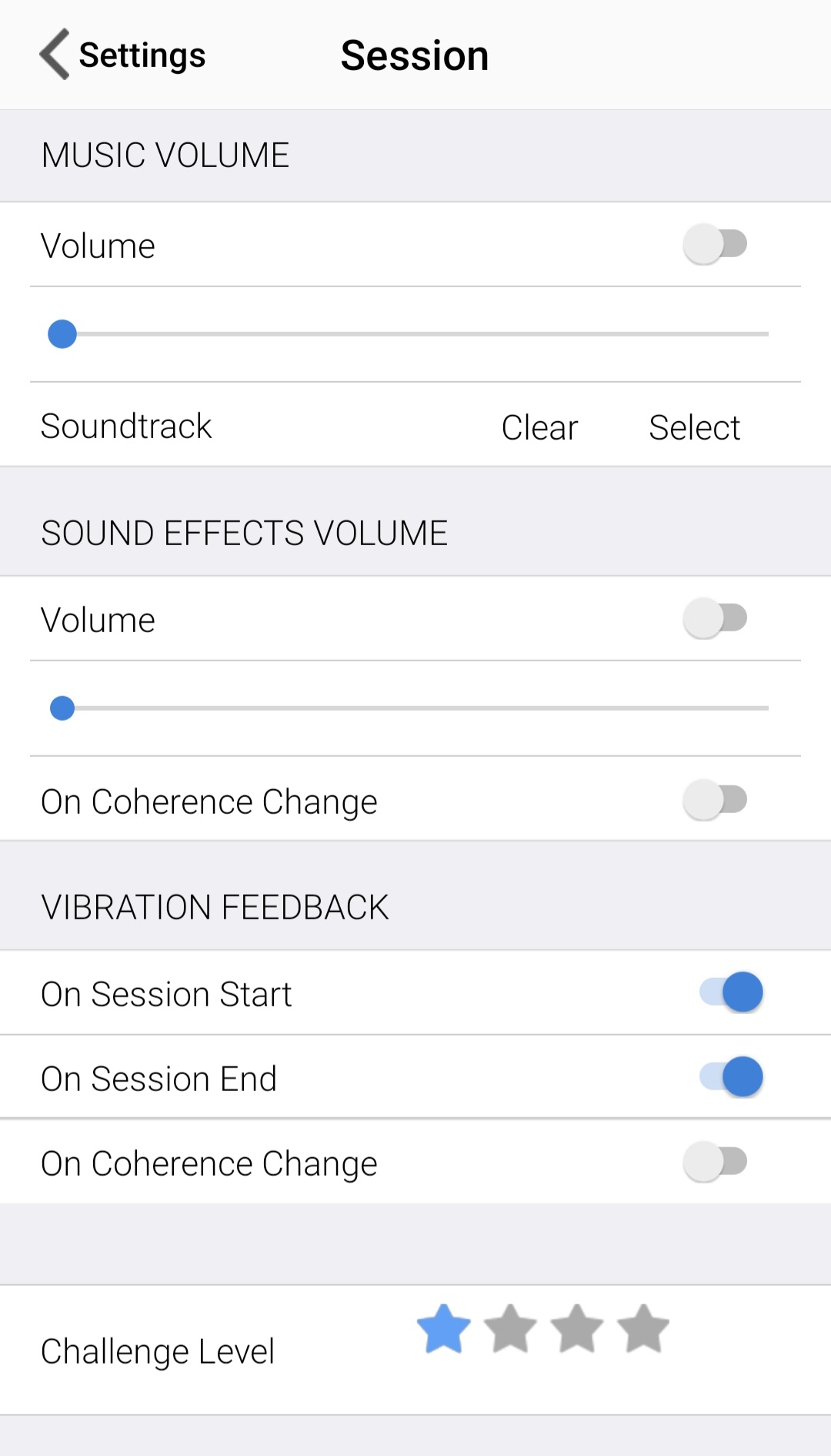 SELLECT EFFECT VOLUME nechávám vypnutý, aby se mi nepřehrávaly zvuky aplikace při změně koherence. Můžete si je nechat zapnuté, ale pro mě je příjemnější provádět trénink v klidu 🙂