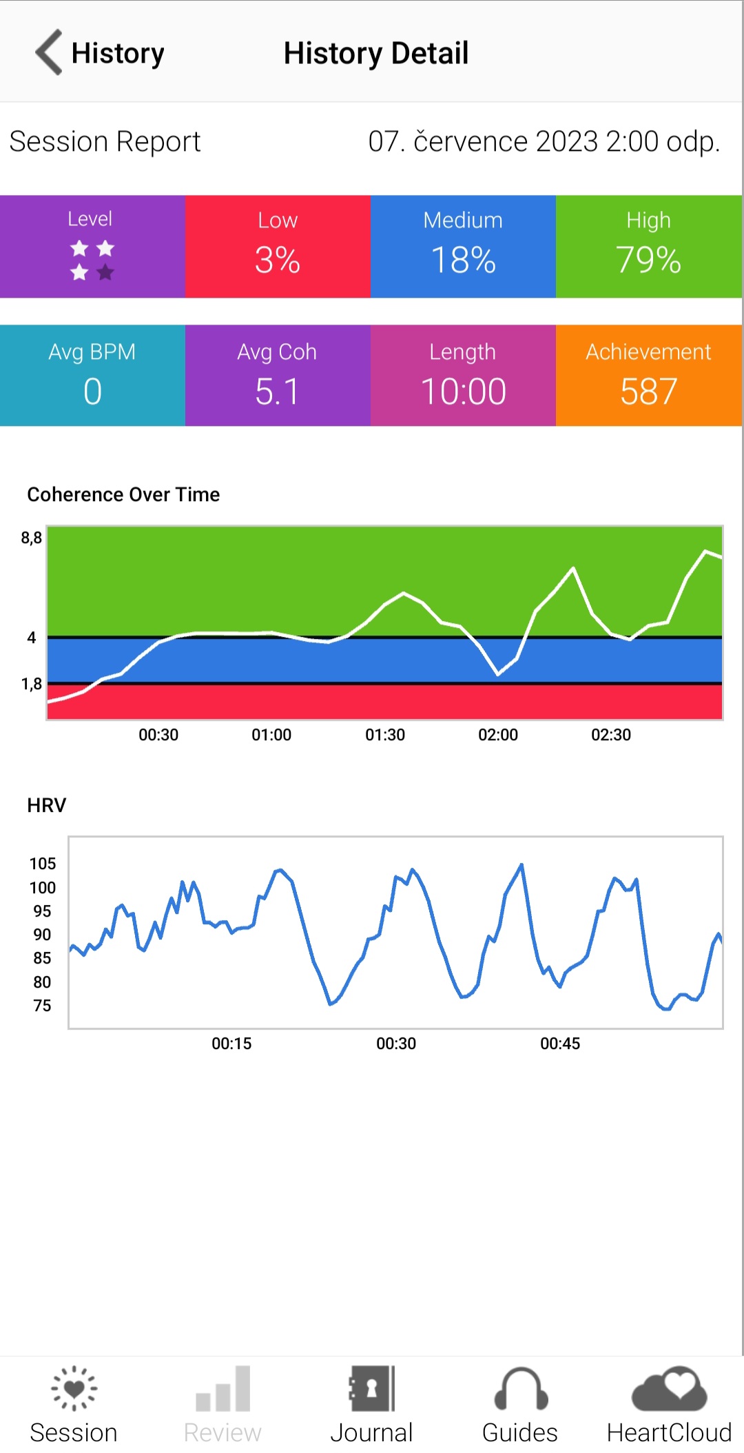 Červené, modré a zelené políčko ukazuje, kolik % koherence jste strávili v nízkém, středním a vysokém nastavení.