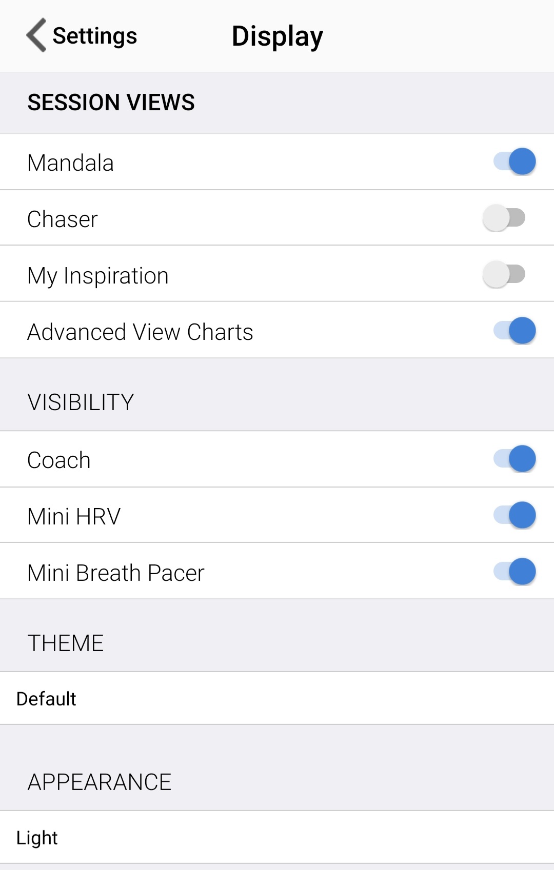 V položce menu v nastavení - SESSION DISPLAY OPTIONS mějte zaškrnuto - MANDALA a ADVANCED VIEW CHARTS. Jsou to ukazatele, které nám bohatě stačí pro tréninky. V položce VISIBILITY nechávám zaškrnuté vše.